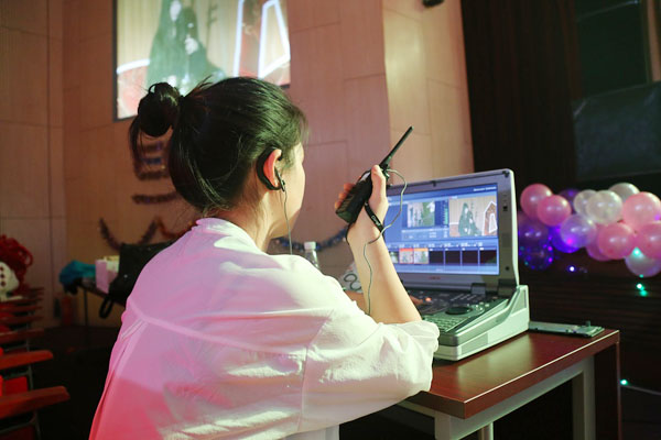 随后,项目管理办公室的老师,在主任刘艳琴老师的带领下,以一曲“相亲相爱一家人”将学院国际部“以爱为本”的理解表达的淋漓尽致。简洁的服装使得女老师清丽无匹,男老师更加精气高亢。歌曲时间虽短,但留下的靡靡之音,始终萦绕在会场,未曾消逝。