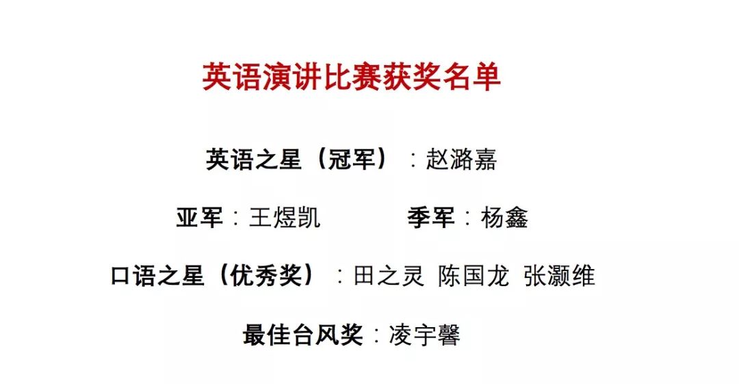 最后本次比赛共决出英语之星、亚军、季军各1名,口语之星3名,最佳台风奖1名(以上为获奖名单)恭喜以上同学!另外颁奖仪式将在元旦晚会举行。